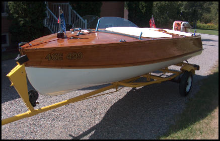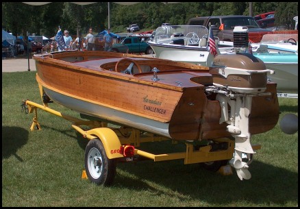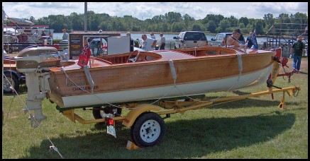 Pictured here on display at the July 2009 AOMCI Super Meet at Constantine MI with the second motor to grace her transom, a nice original 1957 Johnson Javelin.
