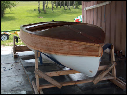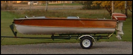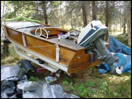 As acquired in the fall of 2005, with a 1961 Evinrude 28 hp Speedytwin. Found in the local 'Bargain Hunter' Magazine, she apparently sat under those tarps for over two years with no one even looking at her for quite some time! Her second owner put her on the roller trailer over five years ago, but she was previously stored in a boathouse.
