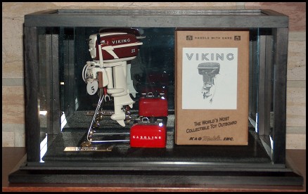 The final days of 2008, declared the “Year of the Viking” by the Maple Leaf Chapter of the AOMCI produced one more big surprise in the form of a new spectacular piece for my collection. For Christmas I received from my wife an incredibly detailed Viking Toy Outboard Motor in a custom glass case.